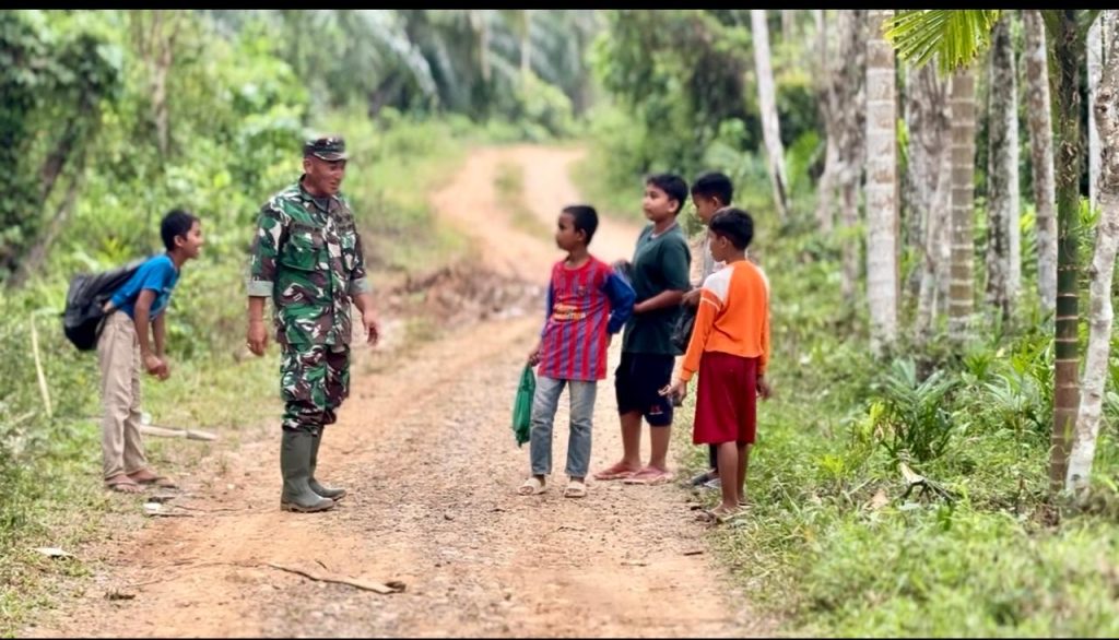 Di tengah kesibukan pembangunan infrastruktur desa, para prajurit tidak hanya fokus pada pengerjaan fisik, tetapi juga membangun kedekatan sosial dengan masyarakat, khususnya anak-anak. Momen kebersamaan itu tampak saat anggota Satgas TMMD berjalan bersama anak-anak di jalan tanah yang menjadi akses utama menuju kebun dan sekolah.