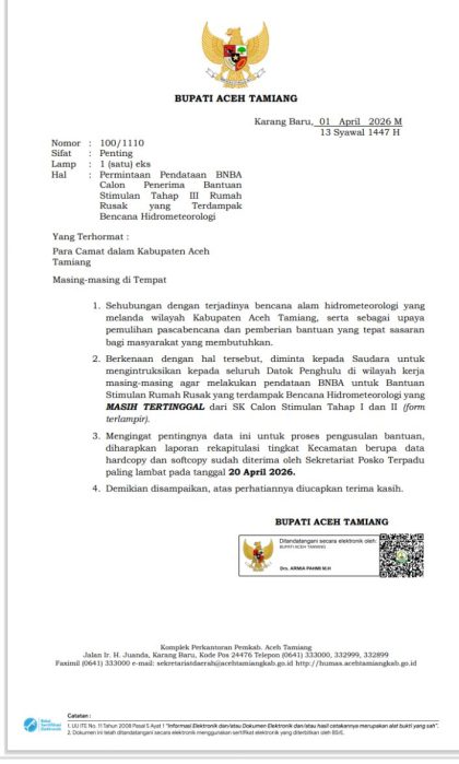 DAERAH | • 5 April 2026 • Perluas Pendataan, Pemkab Aceh Tamiang Kejar Bantuan ACEH TAMIANG | Pemerintah Kabupaten Aceh Tamiang mempercepat sekaligus memperluas pendataan ulang korban bencana hidrometeorologi...